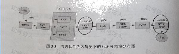 请对照图3-3给出的考虑软件失效情况下的系统可靠性分布图(这里,假设SYS1软件非常可靠,系统仅仅将圈中的软件可靠性加入系统可靠性的评估过程),说明此时的系统可靠性(MTTF)应大于还是小于不考虑软件失效的MTTF?并计算出此时的系统可靠性(MTTF)是多少?