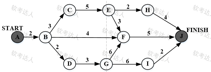 某软件项目的活动图如下图所示,其中顶点表示项目里程碑,连接顶点的边表示包含的活动,边上的数字表示活动的持续时间(天),则完成该项目的最少时间为( )天。活动BC和BF分别最多可以晚开始( )天而不会影响整个项目的进度。