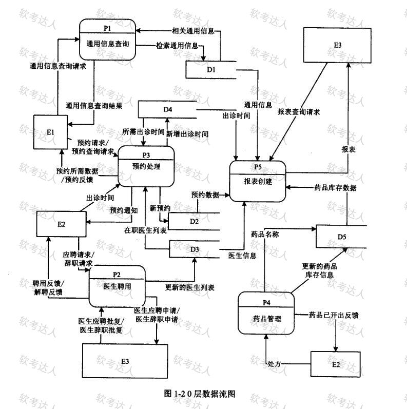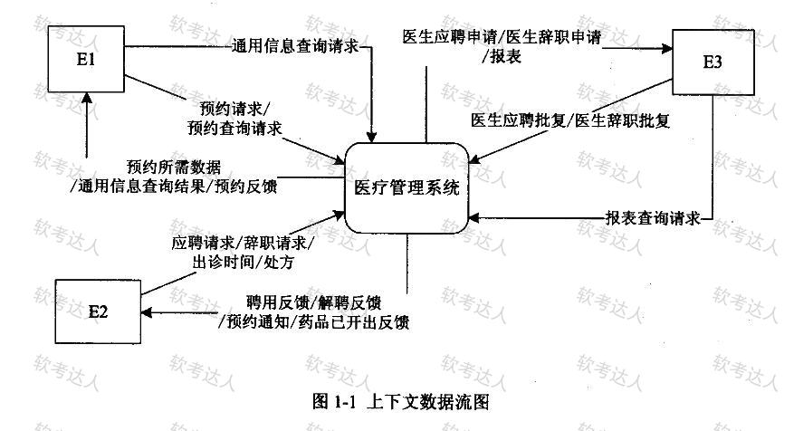现采用结构化方法对医疗管理系统进行分析与设计,获得如图1-1所示的上下文数据流图和图1-2所示的0层数据流图。