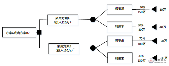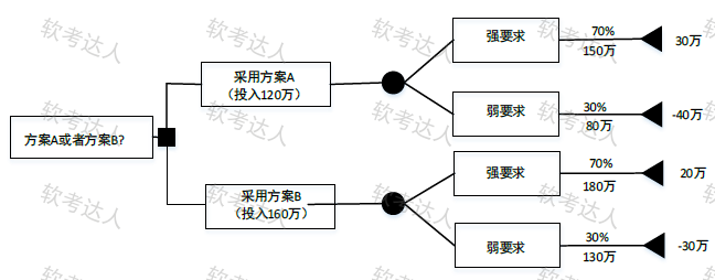 某公司正在准备竞标一系统集成项目,为了估算项目的收益,技术总监带领风险管理团队,对项目可选的两种集成实施方案进行了决策树分析,分析图如下所示。以下说法中,正确的是( )。