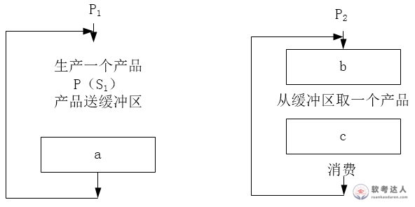某系统中有一个缓冲区,进程P1不断地生产产品送入缓冲区,进程P2不断地从缓冲区中取出产品消费,用P、V操作实现进程间的同步模型如下图所示。假设信号量S1的初值为1,信号量S2的初值为0,那么a、b、c处应分别填( )。