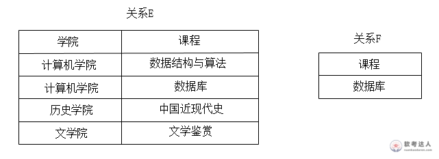 如下表所示,有两个关系E和F,若它们经过某一关系运算后的结果为{计算机学院},这一关系运算为( )。