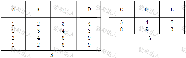 若关系 R、S 如下图所示,π1,3,7(σ3<6(R×S))= ( ),且结果集的元组列数和元组个数分别为 ( ) ,R ÷ S= ( ) 。