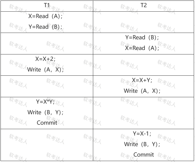 下表为两个事务T1和T2的一个并发调度。其中,数据项A的初值为3,B的初值为4;变量X、Y为事务中的局部变量。语句X=Read(A)表示读取数据项A的值到变量X,Write(A,X)表示将变量X的值写入数据项A中。此并发调度执行结束后A和B的值分别为( );该调度( )。