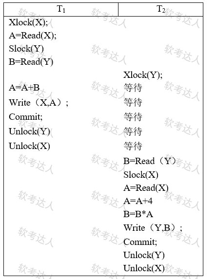 下表是某两个事务并发执行时的调度过程,这里不会出现不可重复读的问题,是因为这两个事务都使用了( );