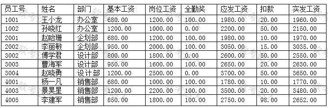 假定某企业根据2014年5月员工的出勤率、岗位、应扣款得出的工资表如下: