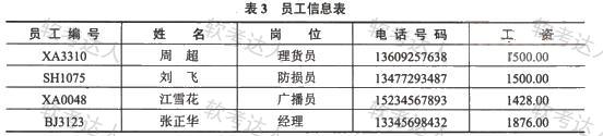 3.每个部门雇用了多名员工处理日常事务,每名员工只能属于一个部门(新进员工在培训期不隶属于任何部门)。员工需要记录的信息包括员工编号、姓名、岗位、电话号 码和工资。员工信息如下表3所示。
