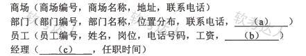 根据实体联系图,将关系模式中的空(a)~(c)补充完整,并分别给出部门、员工和经理关系模式的主键和外键。