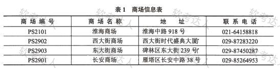 1.商场需要记录的信息包括商场编号(商场编号不重复)、商场名称、地址和联系电话。某商场信息如下表1所示。