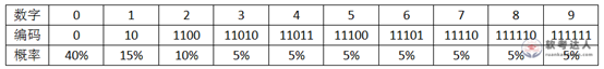 下表列出了数字0~9的某种二进制编码值及其在某类应用中出现的概率,这种编码的平均位数大约为( )。
