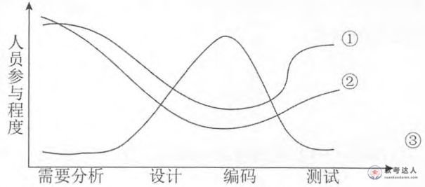 在软件开发的各个阶段,不同层次的人员参与程度并不一样。下图大致描述了某软件开发公司高级技术人员、管理人员和初级技术人员在各个阶段参与的程度,其中,曲 线①、②、③分别对应( )。