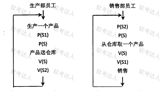 假设某企业有一个仓库。该企业的生产部员工不断地将生产的产品送入仓库,销售部员工不断地从仓库中取产品。假设该仓库能容纳n件产品。采用PV操作实现生产和销售的同步模型如下图所示,该模型设置了3个信号量S、S1和S2,其中信号量S的初值为1,信号量S1的初值为( ),信号量S2的初值为( )。
