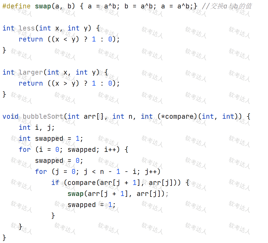 函数bubbleSort(int arr[],int n, int(*compare)(int,int))的功能是根据调用时传递的比较函数compare对数组arr的前n个元素进行排序。