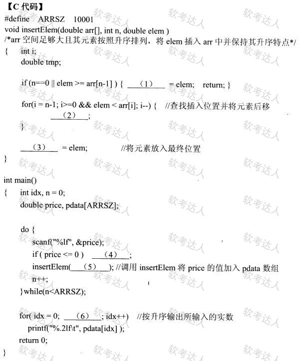 函数insertElem 的功能是在元素升序排列的数组中加入一个新元素并保持数组元素升序排列的特点。在main函数中输入若干表示价格的实数,输入为0或负数或实数个数超出限定数量时终止,调用insertElem将价格按升序保存在数组pdata中,最后输出所输入的实数。