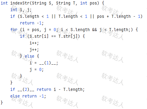 函数indexStr(S,T,pos)的功能是:在S 所表示的字符串中,从下标pos开始查找T所表示字符串首次出现的位置。方法是:第一趟从S中下标为pos、T中下标为0的字符开始,从左往右逐个对于来比较S和T的字符,直到遇到不同的字符或者到达T的末尾。若到达T的末尾,则本趟匹配的起始下标pos为T出现的位置,结束查找;若遇到了不同的字符,则本趟匹配失效。下一趟从S中下标pos+1处的字符开始,重复以上过程。若在S中找到T,则返回其首次出现的位置,否则返回-1。