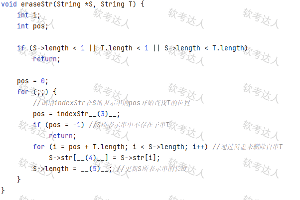 函数 eraseStr(S,T)的功能是删除字符串S中所有与T相同的子串,其处理过程为: 首先从字符串S的第一个字符(下标为0)开始查找子串T,若找到(得到子串在S中的起始位置),则将串S中子串T之后的所有字符向前移动,将子串T覆盖,从而将其删除,然后重新开始查找下一个子串T,若找到就用后面的字符序列进行覆盖,重复上述过程,直到将S中所有的子串T删除。