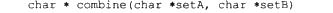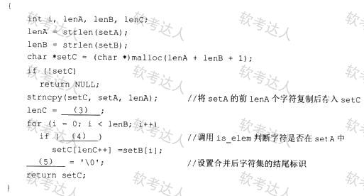 函数char*combine(char*setA,char*setB)的功能是将字符集合A(元素互异,由setA表示)和字符集合B(元素互异,由setB表示)合并,并返回合并后的字符集合。