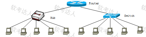 下图所示Router为路由器,Switch为二层交换机,Hub为集线器,则该拓扑结构共有( )个广播域,( )个冲突域。