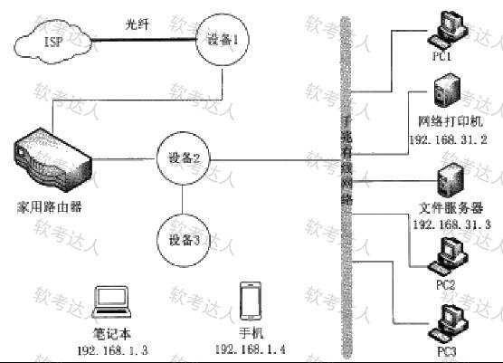 如果设备3采用默认方式接入网络,笔记本、手机等无线设备,从设备3中获取的IP地址与有线网络设备获取的地址(8)同一个IP网段。无线设备如果要正常访问Internet,设备3至少应该提供(9)和(10)服务。