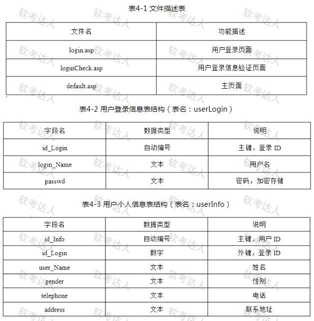 某信息系统需要在登录页面输入用户名和密码,通过登录信息验证后,跳转至主页面,显示该用户的姓名等个人信息。文件描述如表4-1所示,登录信息和个人信息均存储在Access数据库中,如表4-2和表4-3所示。