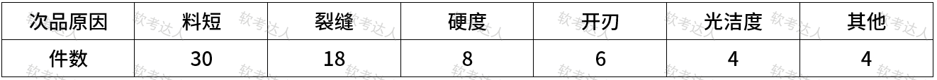 某厂在一次产品质量检查中发现了70件次品,按次品原因统计如下表。根据此表,可以推断,( )是主要的次品原因,占总次品件数约70%。