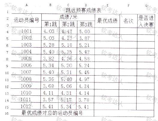 在Excel的Sheet1工作表的A1:G16单元格内创建“跳远预赛成绩表”(内容如下图所示)。按题目要求完成后,用Excel的保存功能直接存盘。(表格没创建在指定区域将不得分)