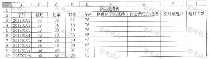 4.用IF函数计算每名学生应选择文科或理科,如果物理化学总成绩大于政治历史总成绩,在对应单元格中填入“理科”,否则填入“文科”。