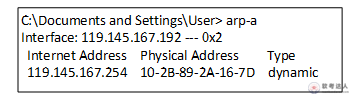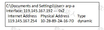 某用户正在Internet浏览网页,在Windows命令窗口中输入arp-a命令后,得到本机的ARP缓存记录如下图所示。图中119.145.167.254是( )的IP地址。
