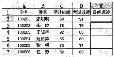 在下图所示的工作表中,若学生的最终成绩等于平时成绩的30%加上考试成绩的70%,那么应在E2单元格中填写( )),并( )拖动填充柄至E7单元格,则可自动算出这些学生的最终成绩。