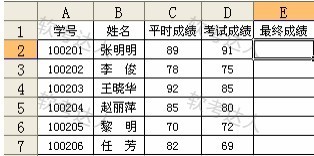 在下图所示的工作表中,若学生的最终成绩等于平时成绩的30%加上考试成绩的70%,那么应在E2单元格中填写( ),并 ( )拖动填充柄至E7单元格,则可自动算出这些学生的最终成绩。