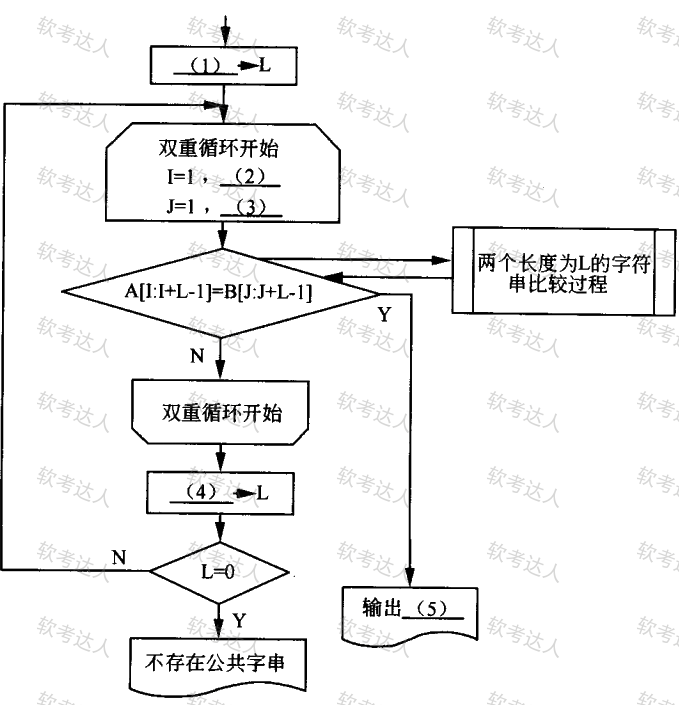 本流程图采用的算法是:从最大可能的公共子串长度值开始逐步递减,在A、B字符串中查找是否存在长度为L的公共子串,即在A、B字符串中分别顺序取出长度为L 的子串后,调用过程判断两个长度为L的指定字符串是否完全相同(该过程的流程略)。