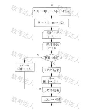 以下的流程图计算两个非空整数集合(以数组表示)的交集和并集,并计算其相似度。已知整数组A[1:m]和B[1:n]分别存储了集合A和B的元素(每个集合中包含的元素各不相同),其交集存放于数组C[1:s],并集存放于数组D[1:t],集合A和B的相似度存放于SIM。