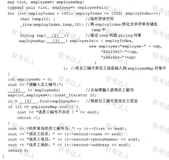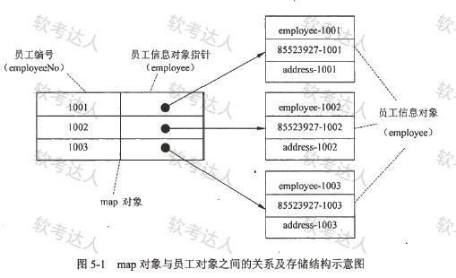 下面的C++代码中使用了 map和pair模板类,将编号为1001、1002、1003的员工 信息插入到map对象中,然后输入一个指定的员工编号,通过员工编号来获取员工的基本信息。员工编号为整型编码,员工的基本信息定义为类employee。map对象与员工对象之间的关系及存储结构如图5-1所示。