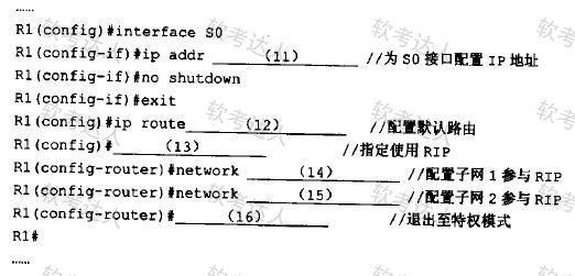 根据题目要求,该企业通过RIP路由协议完成子网之间的互访,同时使用静态路由接入互联网,根据图3-1中拓扑信息,按照题目要求完成路由器R1的配置命令。