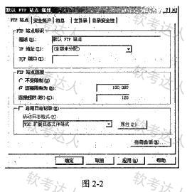 图2-2是配置FTP服务时的FTP站点选项卡,“IP地址”栏的值为(1);TCP端口默认倌为(2)。