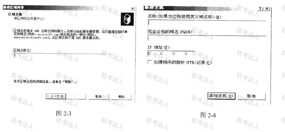 为了使DNS服务器正确解析本地Web站点的域名,需对DNS服务器进行配置。在图2-3中,新建的区域名称是( ),图2-4中添加的新建主机名称为( ),IP地址栏应填入( )。