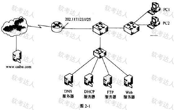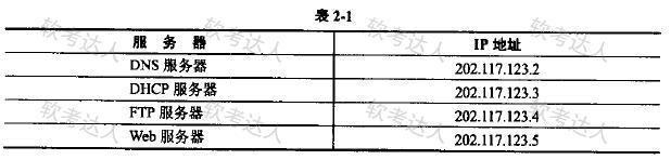 某网络拓扑结构如图2-1所示,用户由DHCP服务器分配IP地址。FTP服务器的操作系统为Windows Server 2003,各服务器的IP地址如表2-1所示。Web服务器的域名为www.exam.com。