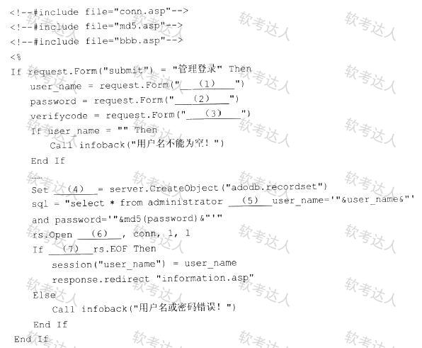 1. 在登录页面login.asp中通过<!--#include file="bbb.asp"-->导入了bbb.asp的代码,以下是bbb.asp的部分代码,请仔细阅读该段代码,将空缺代码补齐。