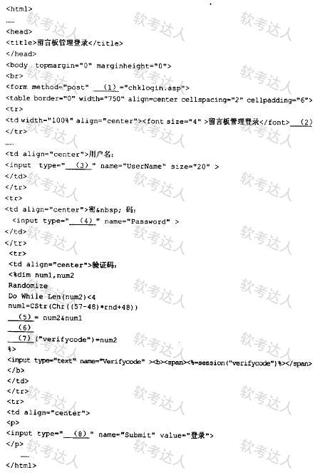 以下是该留言板后台管理登录页面的部分html代码,请根据图4-1将(1)~(8)的空缺代码补充完整。