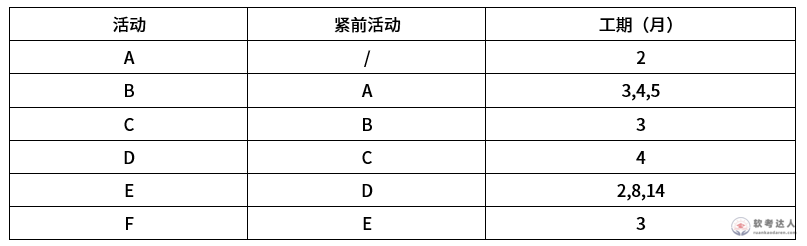 【考生回忆版】某项目各活动的先后顺序及工作时间如下表所示,活动B和E的三个数值为三点估算值,则该项目的总工期为( )月。