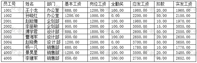假定某企业根据2014年5月员工的出勤率、岗位、应扣款得出的工资表如下: