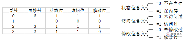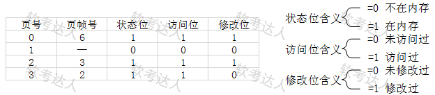 某进程有4个页面,页号为0~3,页面变换表及状态位、访问位和修改位的含义如下图所示。系统给该进程分配了3个存储块,当采用第二次机会页面替换算法时,若访问的页面1不在内存,这时应该淘汰的页号为( )。