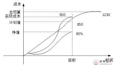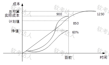 已知某综合布线工程的挣值曲线如下图所示:总预算为1230万元,到目前为止已支出 900万元,实际完成了总工作量的 60%,该阶段的预算费用是 850万元。按目前的状况继续发展,要完成剩余的工作还需要( )万元。