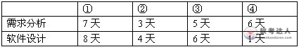 T和H分别作为系统需求分析师和软件设计工程师,参与①、②、③、④四个软件的开发工作。T的工作必须发生在 H 开始工作之前。每个软件开发工作需要的工时如下表所示。
