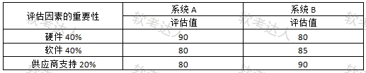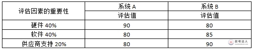 评估和选择最佳系统设计方案时,甲认为可以采用点值评估方法,即根据每一个价值因素的重要性,综合打分来选择最佳的方案。乙根据甲的提议,对系统A和系统B进行评估,评估结果如下表所示,那么乙认为