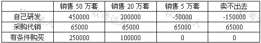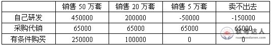 S公司开发一套信息管理软件,其中一个核心模块的性能对整个系统的市场销售前景影响极大,该模块可以采用S公司自己研发、采购代销和有条件购买三种方式实现。S公司的可能利润(单位万元)收入如下表。