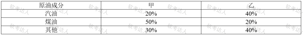 某炼油厂根据计划每季度供应合同单位汽油和煤油各16吨。该厂从甲乙两处场地运回原油提炼。两处原油成分如下表所示,且甲乙两地采购成本分别为200元/吨和300元/吨。对于该炼油厂,需要从乙采购( )吨方能使此次采购的成本最低,最低的采购成本是( )元。