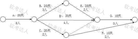 某信息系统集成项目包括7个作业(A~G),各作业所需的时间、人数以及各作业之间的衔接关系如图所示(其中虚线表示不消耗资源的虚作业):