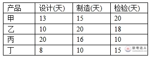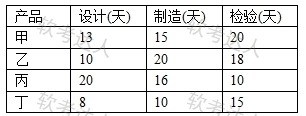 某企业计划研发甲、乙、丙、丁四种产品。每种产品必须依次由设计部门、制造部门和检验部门进行设计、制造和检验,而每个部门必须按同样的顺序处理这几种产品。各种产品的各项工作所需的时间如下表所示。 只要适当安排好产品研发的顺序,企业最快可以在( )天内全部完成这四种产品的研发。