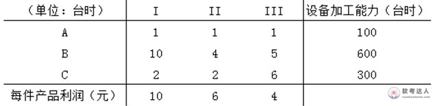 某厂编号为Ⅰ、Ⅱ、Ⅲ的三种产品分别经过A、B、C三种设备加工,已知生产各种产品每件所需的设备台时,各种设备的加工能力(台时)及每件产品的预期利润见表3。 表3 适当安排生产计划可获得最大总利润( )元。